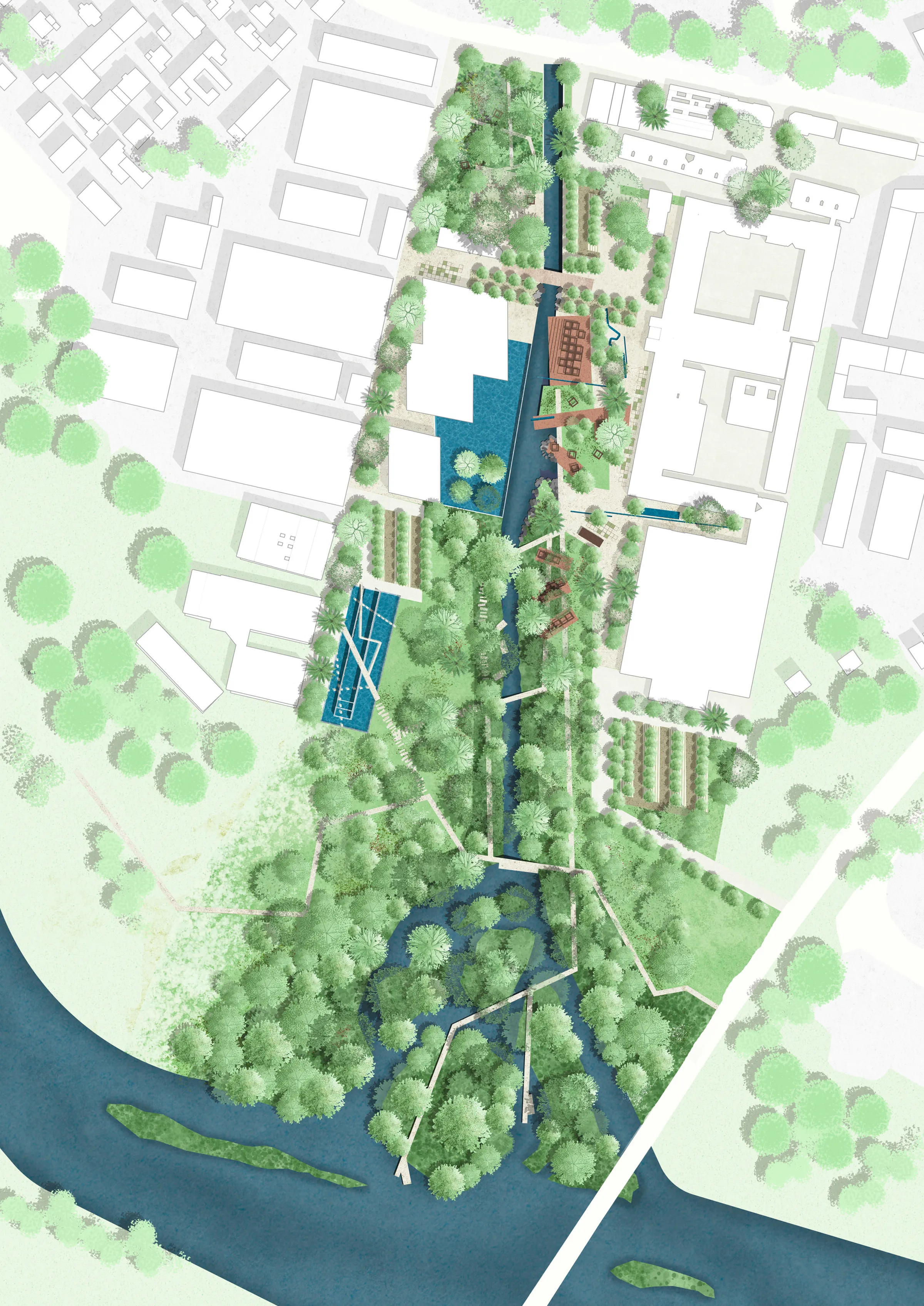 Water, an ever-changing element, shapes the landscape and enhances its perception, creating a mosaic of reflections and colours that interacts with the new architecture and open spaces. The project does not merely outline static forms but envisions transformation as a dynamic process in which time and spontaneous enjoyment play a central role. Citizens are actively engaged in the area's metamorphosis through events, temporary installations, and experimental spaces, fostering a new relationship between humanity and nature.