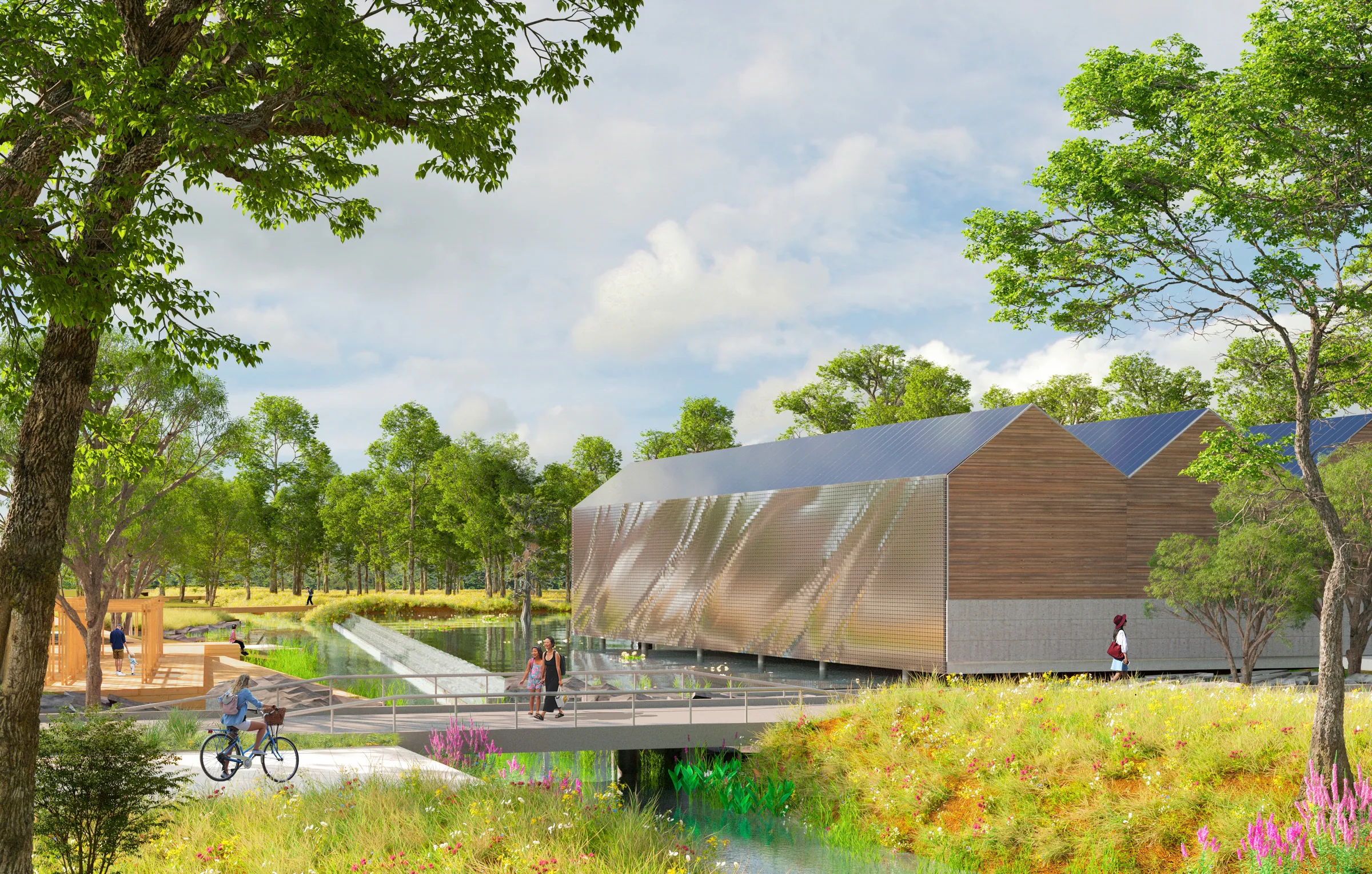 The rediscovery of the Navigliaccio not only connects the existing urban fabric but also strengthens the city's ecological system, reducing hydrogeological risk through intelligent water management and enhancing the wetland's biodiversity. Pedestrian and cycle paths wind through the park, guiding visitors on a journey through shifting landscapes: from more structured urban areas to open spaces where nature prevails.