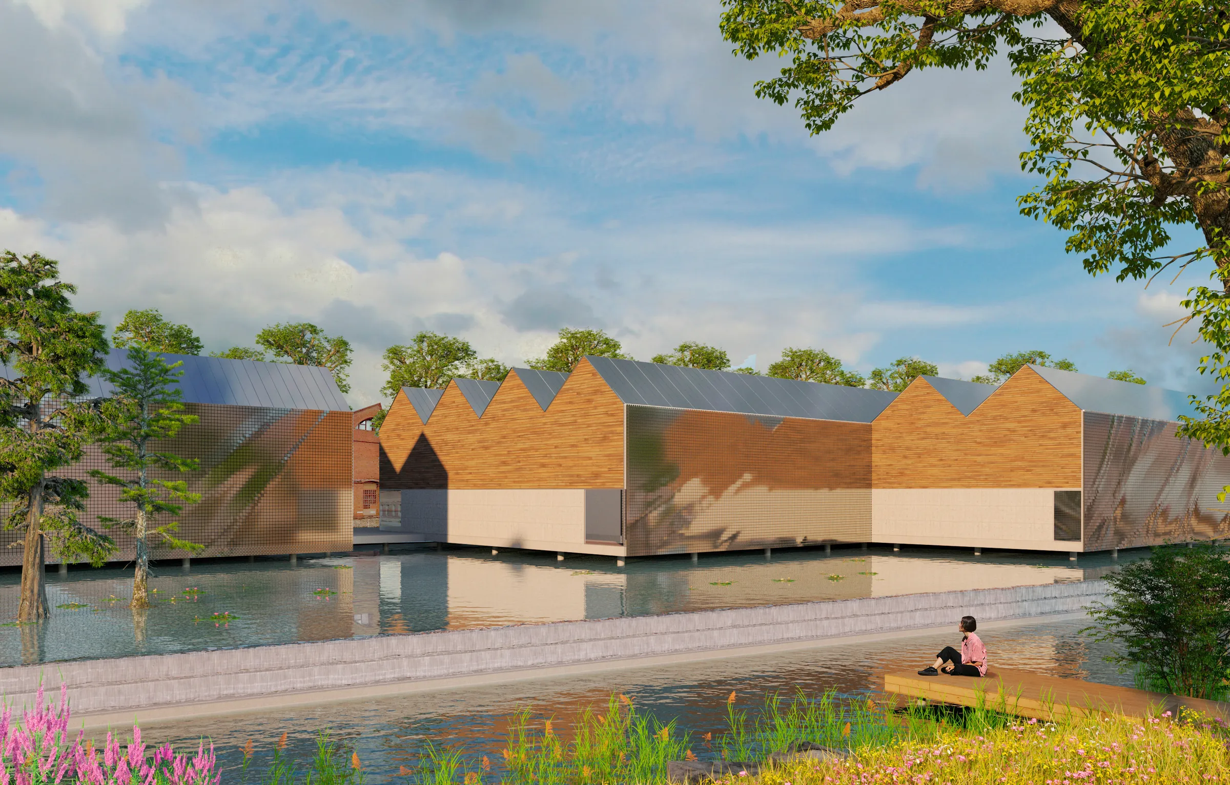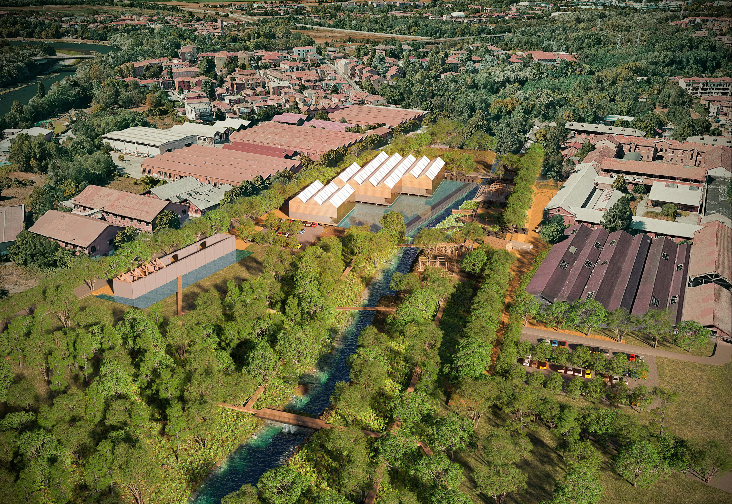 At the centre of this transformation is the new state property archives project, two buildings that blend memory and innovation. Historical industrial architecture is reinterpreted in a contemporary key, with dynamic façades that respond to environmental conditions and materials that dialogue with the river context. The buildings are reflected in the artificial lake surrounding them, making them living elements of the landscape and contributing to a balanced, sustainable microclimate.